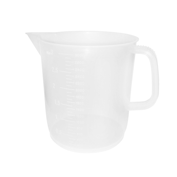 Tato průsvitná plastová odměrka je vyrobena z potravinářského plastu. Má odměrnou stupnici, dělenou po 100 ml, nálevku a ucho pro snadnější manipulaci. Nádoba je autoklávovatelná. Celkový objem nádoby je 3 litry.