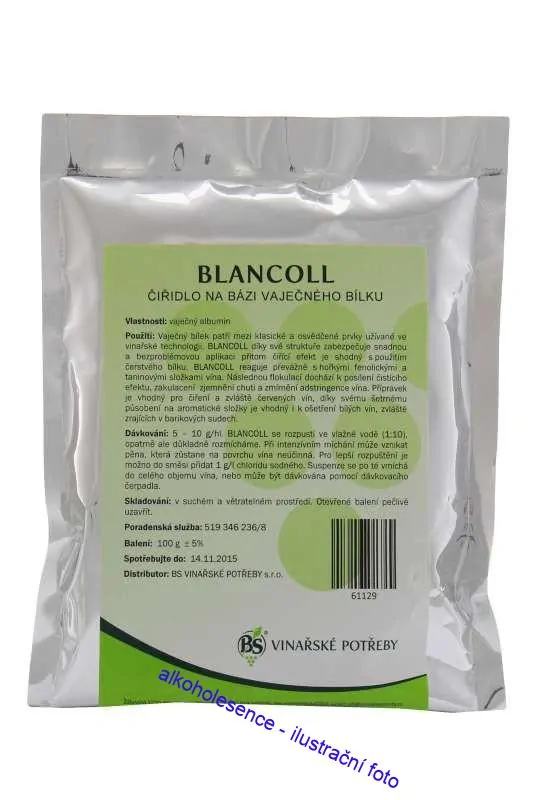 Blancoll obsahuje vaječný bílek patřící mezi klasické a osvědčené prvky užívané ve vinařské technologii. BLANCOLL díky své struktuře zabezpečuje snadnou a bezproblémovou aplikaci přitom čiřící efekt je shodný s použitím čerstvého bílku. BLANCOLL reaguje převážně s hořkými fenolickými a taninovými složkami vína. Následnou flokulací dochází k posílení čistícího efektu, zakulacení zjemnění chuti a zmírnění adstringence vína. Přípravek je vhodný pro čiření a zvláště červených vín, díky svému šetrnému působení na aromatické složky je vhodný i k ošetření bílých vín, zvláště zrajících v barikových sudech. Průměrná doba sedimentace: 2-3 dny.