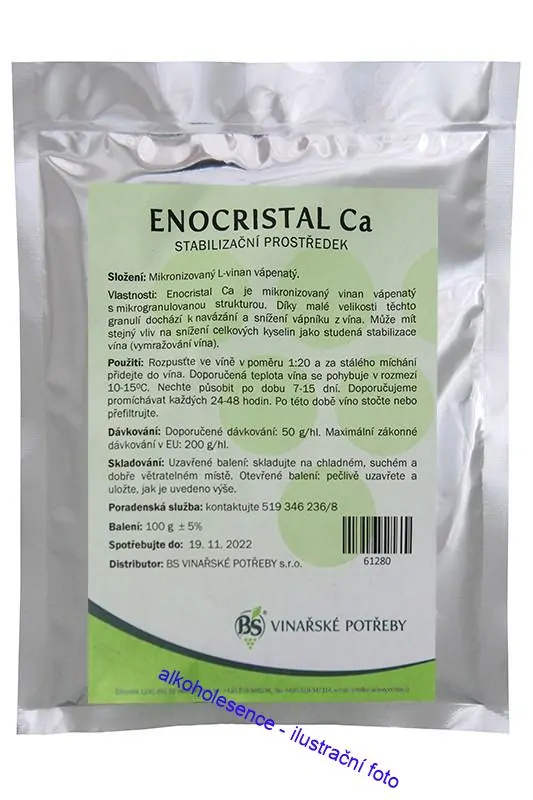 Vlastnosti: Enocristal Ca je mikronizovaný vinan vápenatý s mikrogranulovanou strukturou. Díky malé velikosti těchto granulí dochází k navázání a snížení vápníku z vína. Může mít stejný vliv na snížení celkových kyselin jako studená stabilizace vína (vymražování vína).