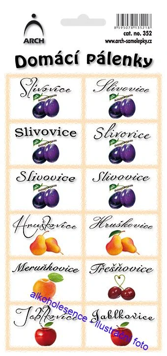 Polep na lahve s motivem mix domácí pálenky - slivovice 6 etiket, hruškovice 2 etikety, meruňkovice 1 etiketa, třešňovice 1 etiketa a jablkovice 2 etikety.